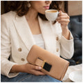 Chic and functional, this Chloe Biscotti two-fold wallet features smooth beige and black leather accented with a signature bow detail. Designed with a secure snap closure, it offers 10 card slots, a zip coin pocket, a gusseted bill compartment, and additional pockets for easy organization.