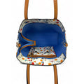 White and multicolor coated canvas Tory Burch Kerrington Square tote with gold-tone hardware, brown leather trim, dual flat shoulder straps, gold-tone logo embellishment at front face, floral print throughout, periwinkle canvas lining, dual pockets at interior walls; one with zip closure and open top. Extremely functional and durable tote bag that is perfect for anytime, anywhere!