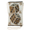 The bag features a top zip closure, allowing easy access to your belongings, and a removable crossbody chain strap for versatile wear. The removable beaded wristlet strap adds convenience and style to the bag's design. The navy dupioni lining enhances the overall aesthetic, and the inside pocket and back slit pocket provide organized storage. The bag is perfectly sized to fit your cell phone.