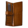 This stylishly slim wallet with extra security has plenty of room for organization. The Valentia II can be tucked inside your handbag or can be carried separately as a wristlet. The Valentia also features a removable slim card case and blocks RFID signals to protect your credit cards and other identification. 100% full-grain leather Interior: 13 credit card slots, ID window, zip pocket, and 2 bill pockets. Leather trimming, nylon lining Exterior: front pocket includes removable card sleeve with 6 credit card slots and 1 bill pocket with magnetic closure, burned edge finish Leather tab with snap closure Signature antique brass hardware, heavy handcrafted stitching